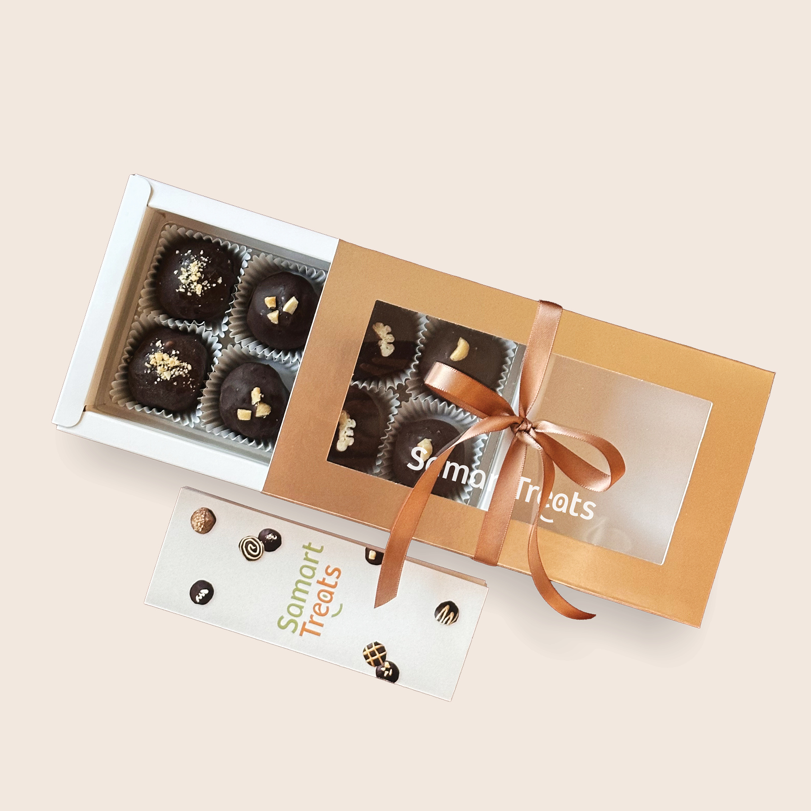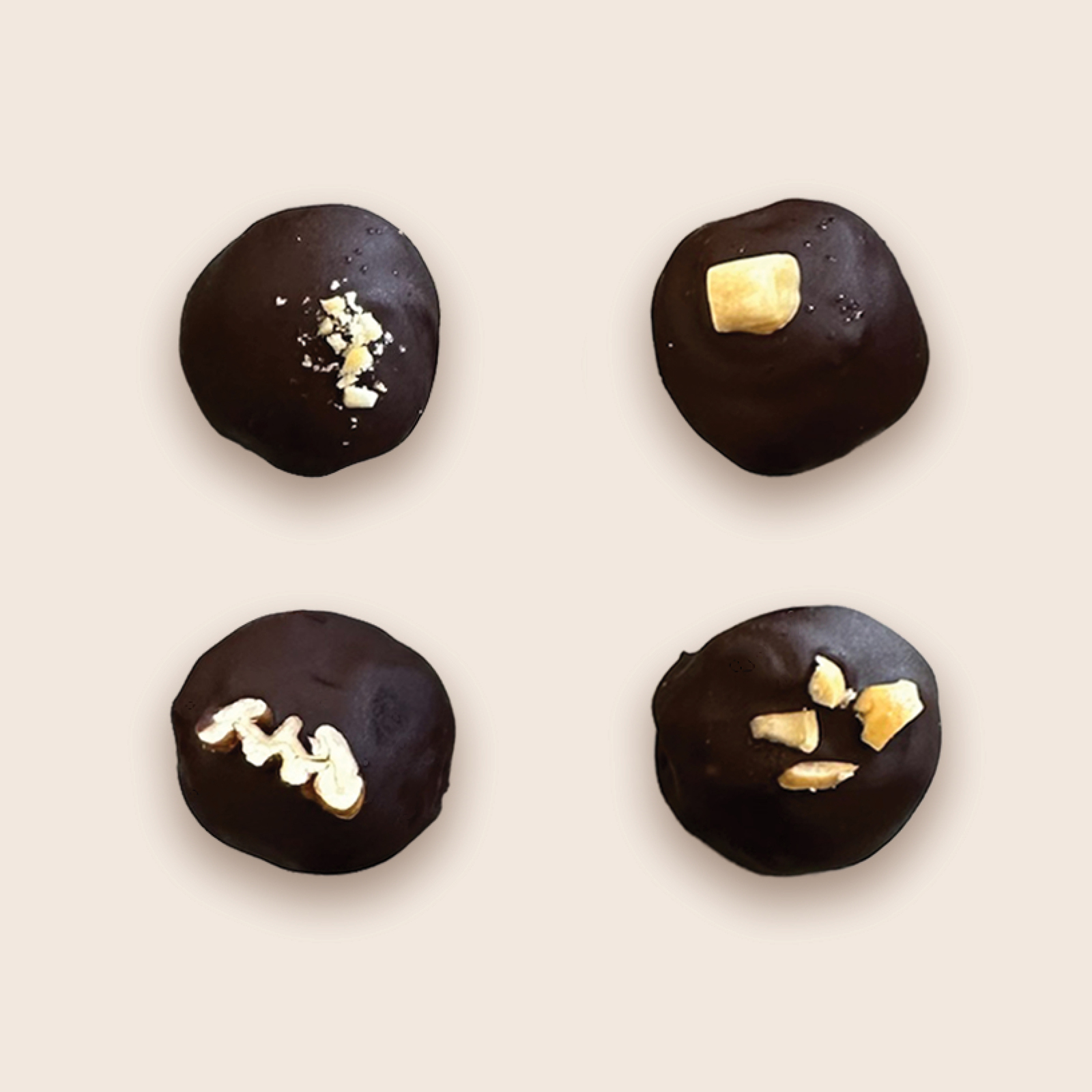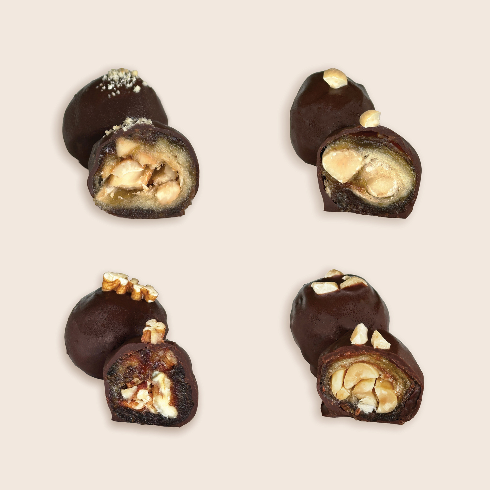 Featuring whole roasted nuts tucked into soft Medjool dates, dipped in rich dark chocolate, and finished with a satisfying crunch. Includes four each of our signature cashew, hazelnut, peanut, and pecan varieties. Perfect for gifting or treating yourself.