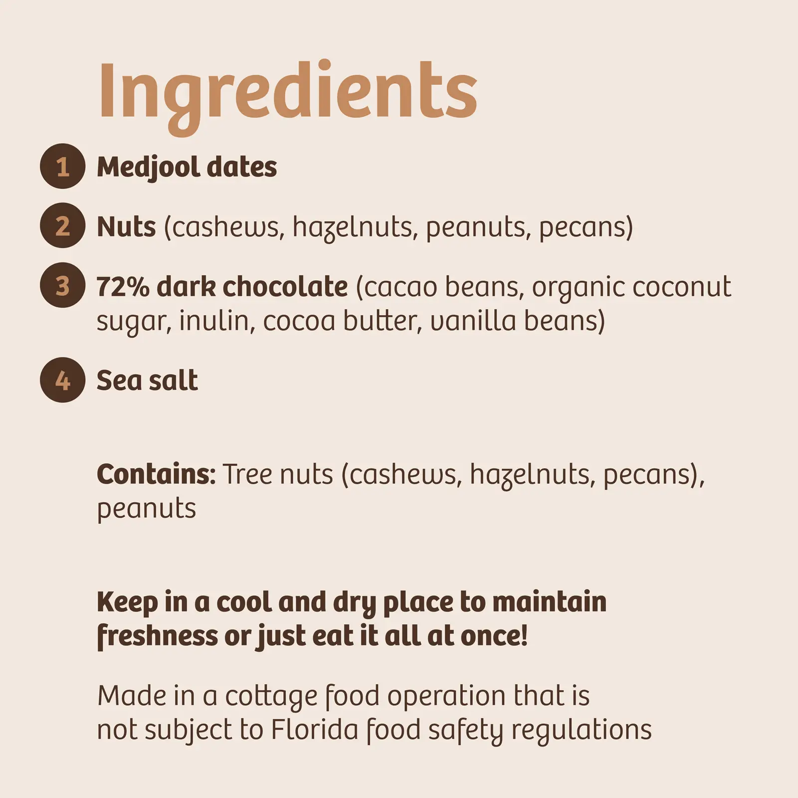 - 72% dark chocolate (cacao beans, organic coconut sugar, inulin, cocoa butter, vanilla beans)
